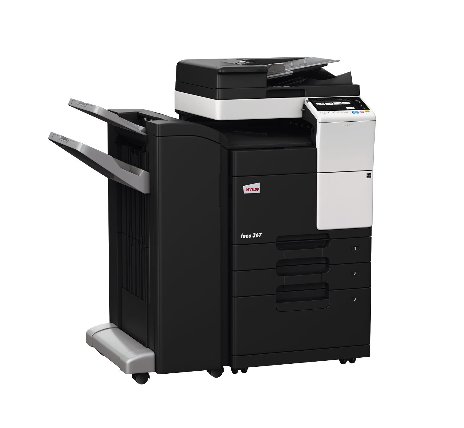 - Kitapçık işlevli ve 50 yapraklık zımbalamalı Floortype sonlandırıcı; maks. iç tepside 3.300 sayfa istifleme kapasitesi; isteğe bağlı delme kiti (2/4 delik)